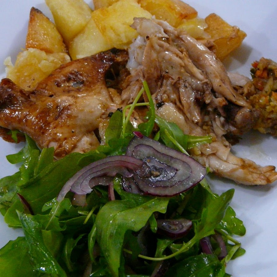 Lo acompañe con ensalada de rúcula y cebolla morada cortada en rodajas bien finitas, aderezada con aceto balsámico y aceite de maíz. (yo a las ensaladas de hojas no las salo).