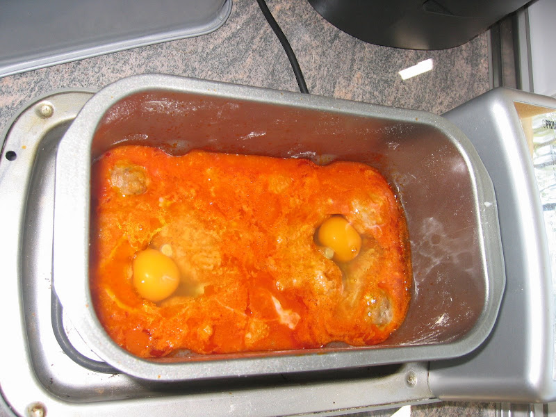 Puse en la panificadora, 1 cartoncito de tomate frito, albahaca, sal pimienta, un poquito de ketchup, y encima las albondigas
