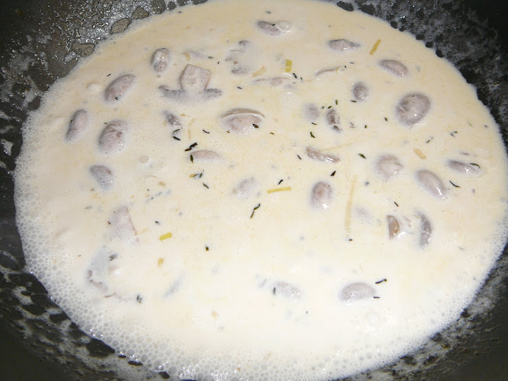 3.- Colocar la mariposa, los champiñones cortados, el vino y el tomillo, programar, 12 minutos, velocidad 1 a 100ºC en retroceso.