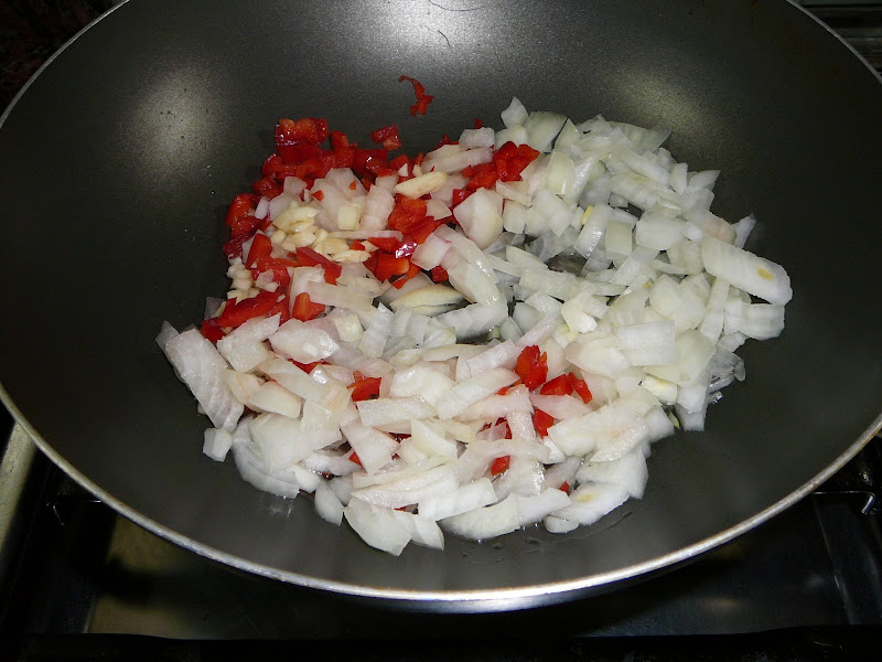 Pongo a rehogar en aceite la cebolla, el morrón y el ajo picado, hasta que estén transparentes y tomen un poco de color.