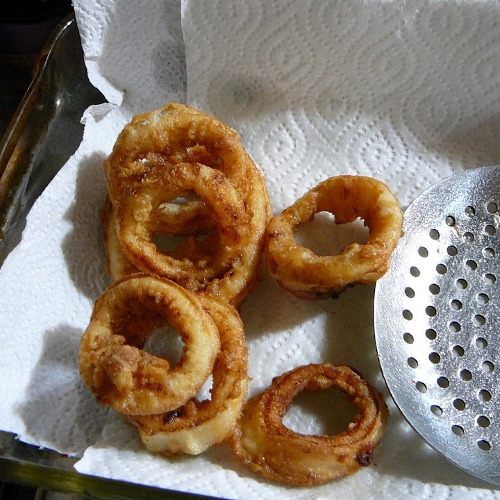 Pasado ese tiempo, se los escurre del bol, y se pone a calentar una ollita con bastante aceite, cuando el aceite alcanzó la temperatura se van colocando los aros de calamares previamente pasados por harina.
