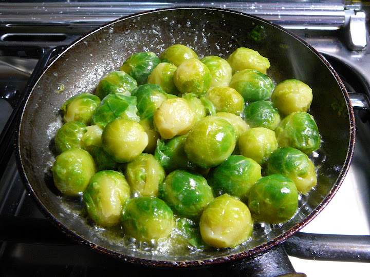 Se le agrega un diente de ajo y cuando el ajo empieza a perfumar se echan los repollitos de Bruselas.