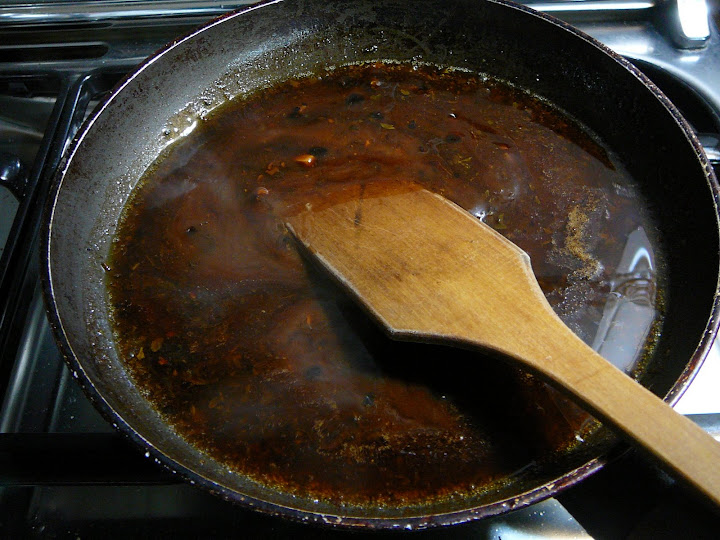 Cuando se retira la carne de la fuente, se le agrega el agua caliente para poder desglazarlo, en este caso tuve que pasarlo a una sartén pero si la fuente es metálica se puede poner sobre la hornalla.