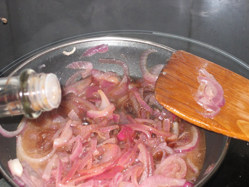 1/2 kg de cebollas cortadas en aros finos, rehogamos a fuego lento hasta que este translucida