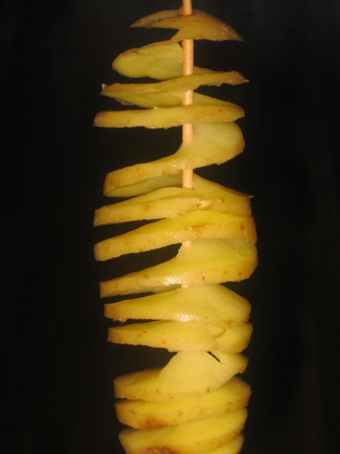 Vamos dando cortes llegando hasta el palillo, y de forma espiral, es decir que no cortamos redondeles, sino que vamos girando el cuchillo sobre el palo, haciendo laminas mas o menos finas, y llegando hasta el final de la patata.
