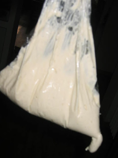 Lo ponemos en una manga pastelera, o bien en una bolsita como hice yo, así despues la tiro, y le hice un agujerito bastante grande, en una de las puntas de abajo