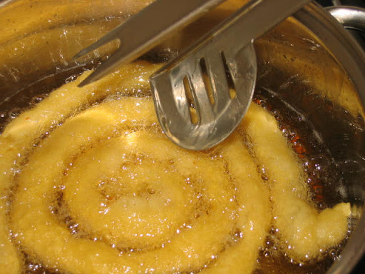 Voy echando la pasta en forma de espiral de adentro hacia afuera. Luego, continuamente voy moviendo esa espiral para que se cocine bien, Despues con la ayuda de 2 tenedores, doy vuelta todo junto, y cocino del otro lado. Conviene dorarlos bien.
