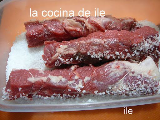 En un recipiente profundo hago una capa o cama de sal gruesa y coloco la carne atada o bridada.
