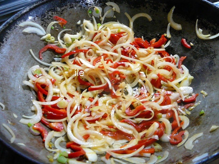 En una sartén grande o en una wok, puse un poco de aceite y salteé la verduras (cebollas, morrón, la parte blanca de la cebolla de verdeo y los ajos).