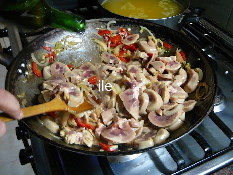 Cuando las verduras se pusieron tiernas y tráslucidas, subo bien fuerte la llama del fuego, y coloco los riñones cortados y los salteo.