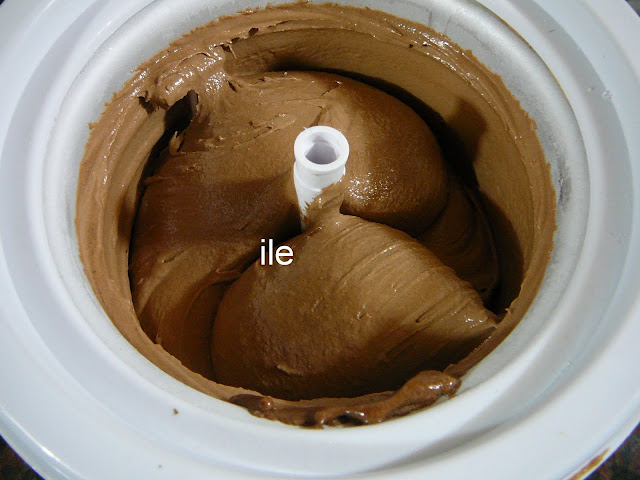 Armo la heladora, saco el bol del frezzer y le pongo la tapa con el motor, lo enchufo y vuelco por la ranura con el aparato en funacionamientolas porciones de mousse con ayuda de una cuchara, pero si tiene una jarra con pico vertedor mejor, así lo terminé haciendo, hasta llegar al borde de las paletas y lo dejo andando por espacio de 45 minutos, hasta que la paleta se para.