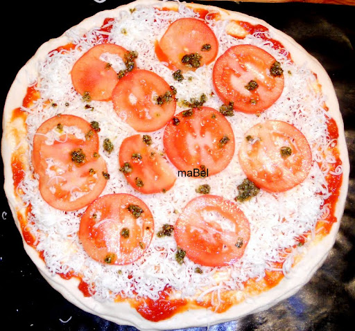 Hornear a 230ºC hasta que esté bien dorada, unos 10 a 15 minutos. Cuando sale del horno, decoro con unas hojas de albahaca fresca, o aceitunas verdes, o nada... Recetas dulces en mi blog http://decoraciondemabel.blogspot.com