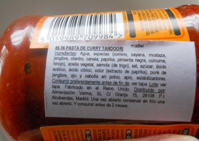 Es tandoori es una mezcla de especia, aquí están los ingredientes que decía el envase, de lo que estaba compuesto. Por lo general se le agrega colorante rojo para darle intensidad, pero con este producto no me hizo falta