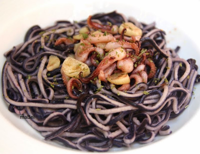 Espaghettis de dos colores con calamares