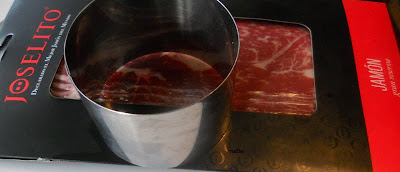 Necesitamos el jamon iberico de bellota y un aro de metal, te muestro el tamaño comparado con el pack, para que te des cuenta.