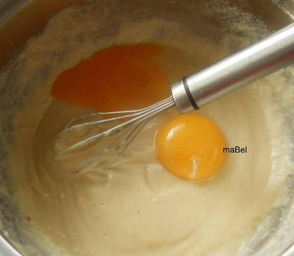 Retirar del fuego, dejar que se le pase el calor fuerte y agregarle 2 yemas
