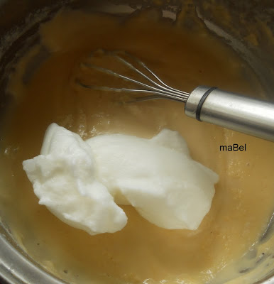 y luego el resto de claras, y mezclar de forma muy suave, para que quede espumosa la mezcla